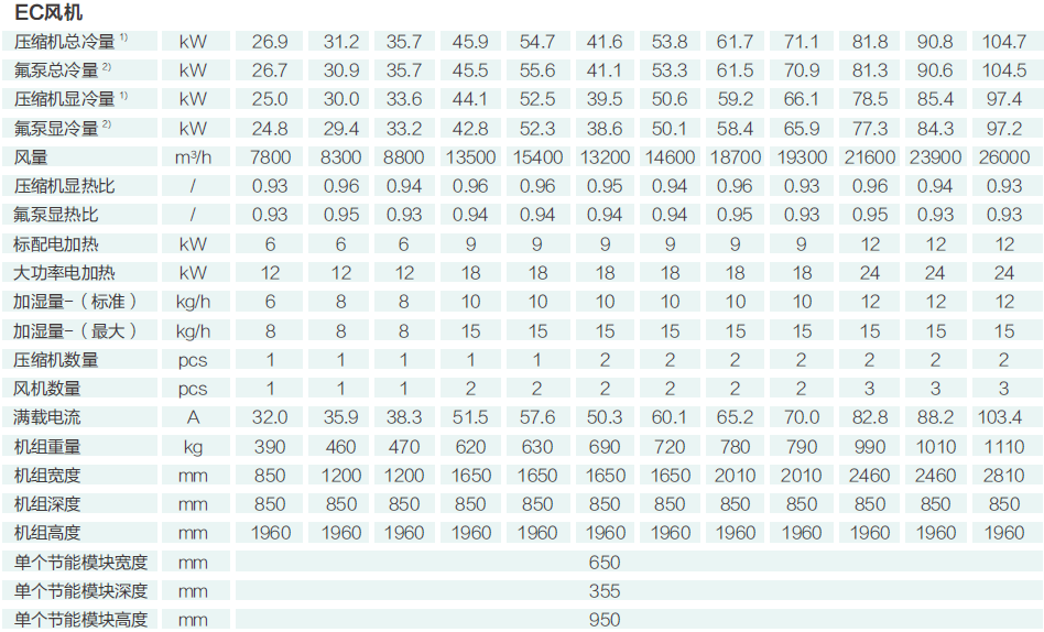 单压缩机制冷系统机型配置一台氟泵自然冷节能模块,双压缩机制冷系统机型配置两台氟泵自然冷节能模块,确保在室外环境温度较低时能关闭全部压缩机,充分利用自然冷源,降低能耗。