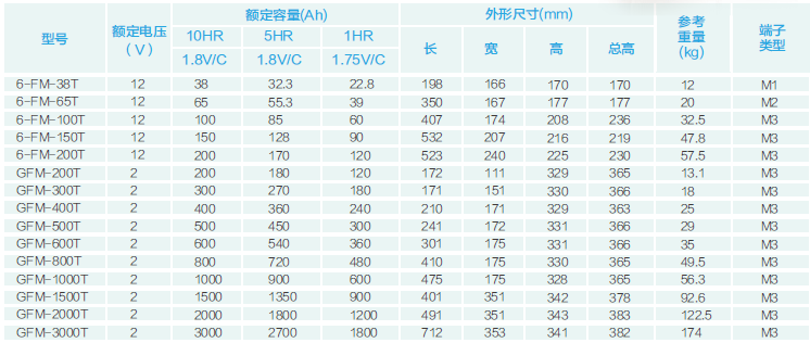 在20℃环境下,FM系列小型密封电池浮充寿命可达3~5年,FM固定型密封电池浮充寿命可达8~10年,FML系列电池浮充寿命可达10年,FMH系列电池浮充寿命可达10年,GFM系列、太阳能深循环系列电池浮充寿命可达15年,GFMJ系列电池浮充寿命可达18年。